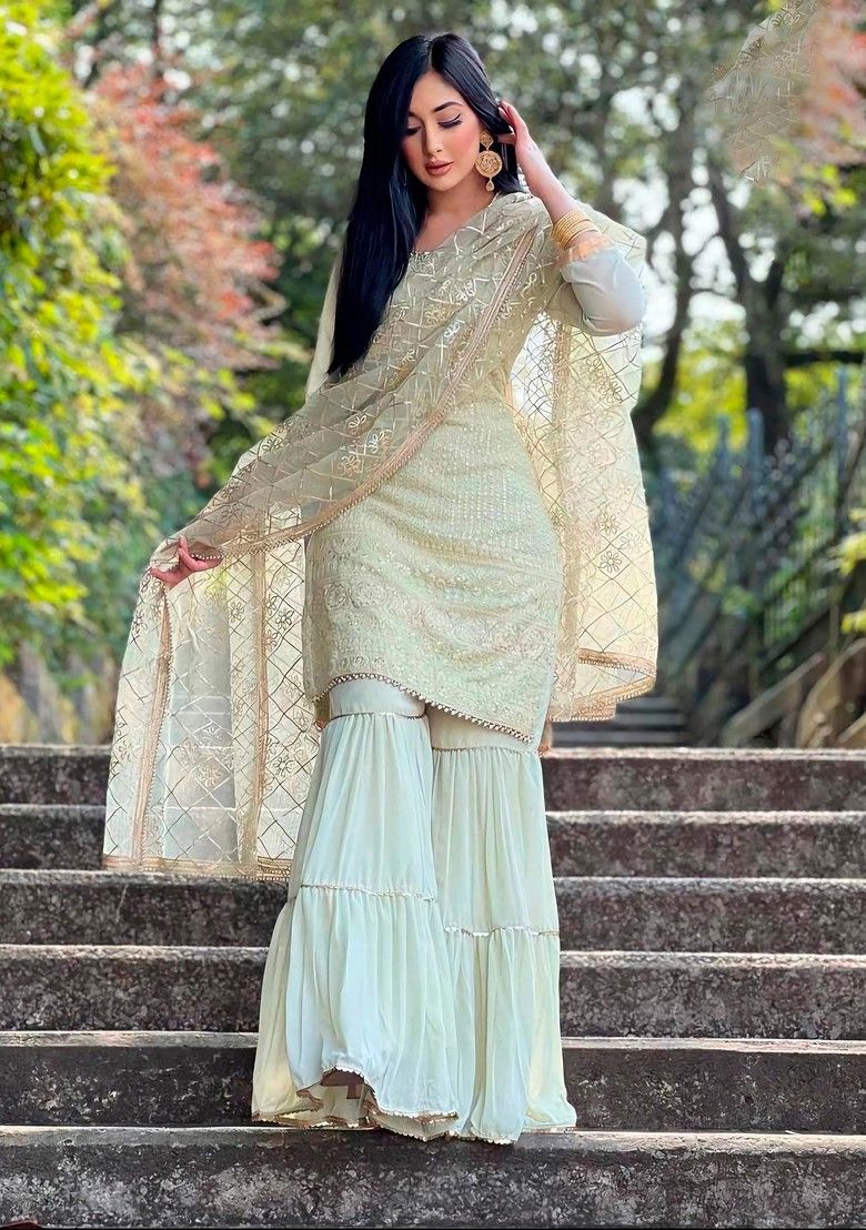 "White Embroidered Faux Georgette Kurta Set - XKS01797 Main Colour: White Package Contents: 3 Components: Kurta, Sharara, Dupatta Fabric: Faux Georgette Work: Embroidered Majority of our items contain embellishments and embroidery and therefore fragile in their usage. From time to time beading/ sequence may get displaced and this is not regarded as a fault but is due to the nature of the work. These garments should be worn with care."
